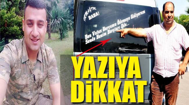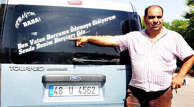 Muğla'nın Milas İlçesi'nden Trabzon'a vatani görevini yapmak üzere giden 21 yaşındaki Mehmet Karacan, borcunu ödemesi için babasının aracına 'Ben vatan borcumu ödemeye gidiyorum sen de benim borçları öde' yazdırdı.Milas'taki düğünlerde müzisyenlik yapan evli ve 2 çocuk babası 48 yaşındaki Servet Karacan, bir süre önce kendisi gibi müzisyen olan oğlu Karacan'ı askere gönderdi. Babasına şaka yapmak istediği belirtilen Karacan, hafif ticari aracına onun haberi yokken 'Ben vatan borcumu ödemeye gidiyorum sen de benim borçları öde' diye yazdırdı. Baba Karacan, yazıda şakayla karışık bir mesaj bulunduğunu belirterek, "Yazı, görenleri güldürüyor. Şaka amaçlı yapılmış; ama aslında şaka değil. Yaklaşık 2 bin 500 lira borç yapmış. O, Trabzon'da askerlik yapıyor. Biz de çalışarak, onun borçlarını ödüyoruz. Bir kısmını bitirdim. Onun canı sağ olsun" dedi.