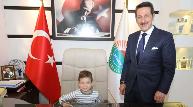 Samsun İlkadım Belediyesi Başkanı Erdoğan Tok, 23 Nisan Ulusal Egemenlik ve Çocuk Bayramı nedeniyle temsili olarak koltuğunu Zübeyde Hanım Anaokulu öğrencisi Çınar Soytürk’e devretti