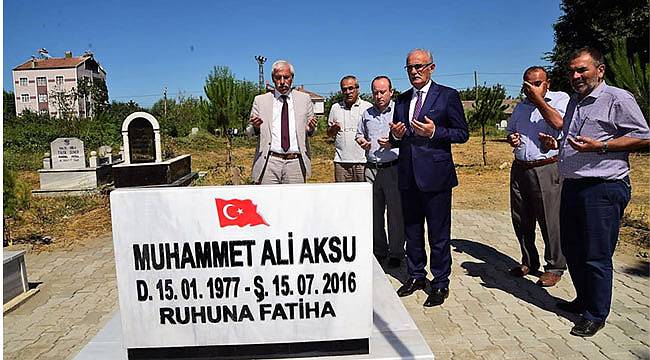Taziye dileklerinin ardından Başkan Yılmaz,Muhammet Ali Aksu’nun kabrini ziyaret etti. Mezar başında dua eden Başkan Yılmaz şehit ailesiyle birlikte mezardaki gülleri suladı.Şehitlerin ölümsüz olduğunu belirten Başkan Yılmaz,"Şehitlerimizin hayatı pahasına Türkiye'nin bağımsızlığını, onurunu koruduklarını biliyoruz. Hepsine ayrı ayrı minnettarız.Bütün şehitlerimize bir kez daha Allah'tan rahmet diliyorum. Teröre karşı mücadelede şehit olmuş çok evladımız, kardeşimiz, hemşerimiz var. Muhammet Ali Aksu da 15 Temmuz canileri tarafından şehit edilmiş bir hemşerimiz. O'na Fatiha okuduk, mezarı başında tekrar anarak ailesine başsağlığı dileklerimizi ilettik,acılarını yeniden paylaştık"dedi.