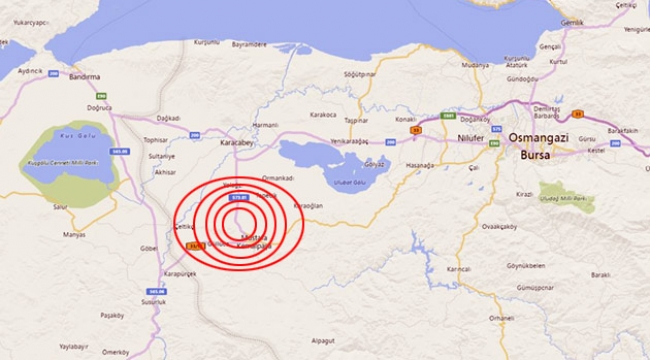 Bursa’da gece yarısı deprem oldu. Boğaziçi Üniversitesi Kandilli Rasathanesi ve Deprem Araştırma Enstitüsü’nün kaydettiği verilere göre deprem saat 00:04’de meydana geldi.Merkez üstü Mustafakemalpaşa ilçesi Hacıahmet mahallesi merkezli deprem yerin 8 kilometre altında gerçekleşti. Ricter ölçeğine göre 4.1 büyüklüğünde gerçekleşen deprem, büyük korku oluşturdu. Birinci derece deprem kuşağında olan Bursa’da sarsıntı 39.7950 enlem, 28.6703 boylamda oldu.Deprem revize edilerek moment büyüklüğü ise 3.9 kayıt edildi. Bir depremin moment büyüklüğü kayıt edilmişse diğer büyüklük ölçüleri dikkate alınmıyor.
