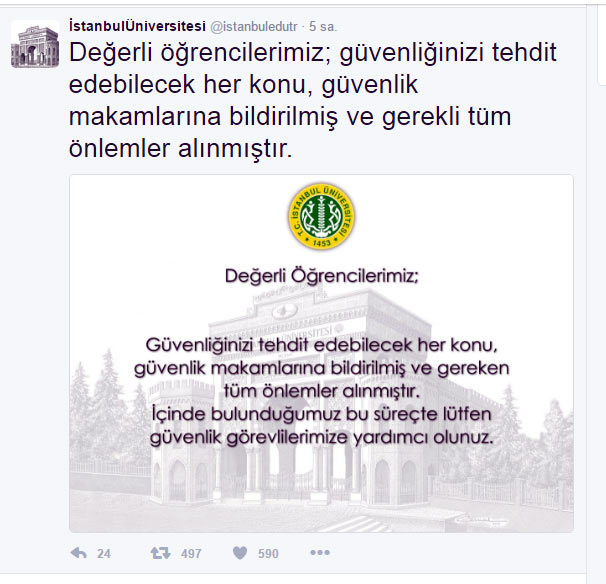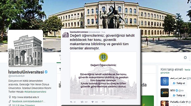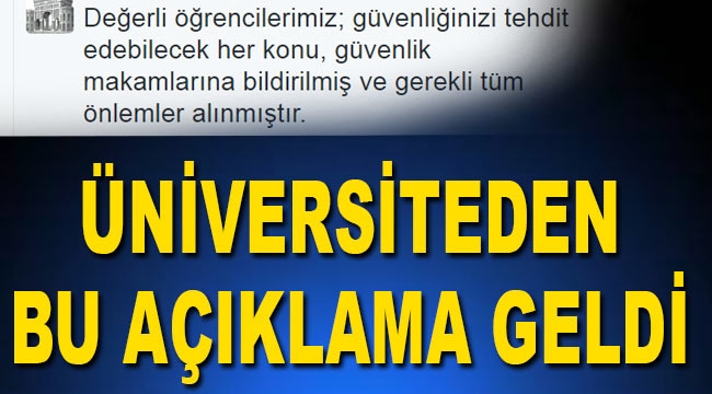 İstanbul Üniversitesi'nin kurumsal Twitter hesabından yapılan açıklamaya göre, "Değerli öğrencilerimiz, güvenliğinizi tehdit edebilecek her konu, güvenlik makamlarına bildirilmiş ve gerekli tüm önlemler alınmıştır" ifadesi kullanıldı.