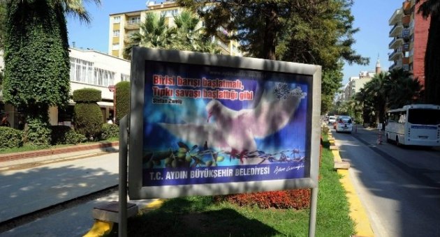 Kendiside iki erkek çocuk annesi olan Aydın Büyükşehir Belediye Başkanı Özlem Çerçioğlu, üstlerinde “Barışta Evlatlar Annelerini, Savaşta Anneler Evlatlarını Toprağa Verirler” ve “Birisi Barışı Başlatmalı, Tıpkı Savaşı Başlattığı Gibi” yazılı bilboadları Aydın İl genelinde astırdı.